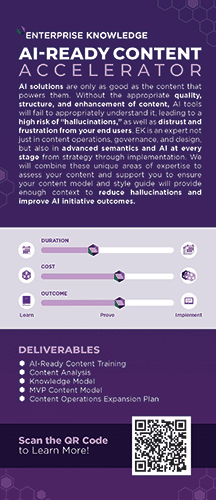 AI solutions are only as good as the content that powers them. When content lacks the necessary quality, structure, and enhancement, AI tools will fail to appropriately understand it, leading to a high risk of “hallucinations,” as well as distrust and frustration from your end users. EK is expert not just in content operations, governance, and design, but also in advanced semantics and AI at every stage from strategy through implementation. We’ll combine these unique areas of expertise to assess your content and support you to ensure your content model will provide enough context to reduce hallucinations and improve AI initiative outcomes.