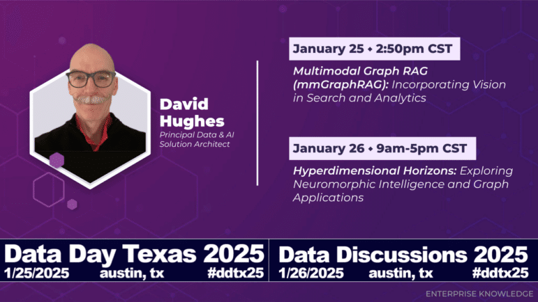 David Hughes, Principal Data & AI Solution Architect at Enterprise Knowledge, will be presenting on an underexplored dimension of GraphRAG–the integration of image–in his talk titled “Unleashing the Power of Multimodal GraphRAG: Integrating Image Features for Deeper Insights” at Data Day Texas 2025 in Austin, TX on Saturday, January 25th at 2:50 CST.