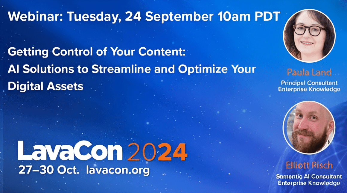 Paula Land, Principal Consultant for Content Strategy and Operations and Elliott Risch, Semantic AI Consultant, will present a pre-conference webinar on the topic of AI-assisted content analysis titled Getting Control of Your Content: AI Solutions to Streamline and Optimize Your Digital Assets.