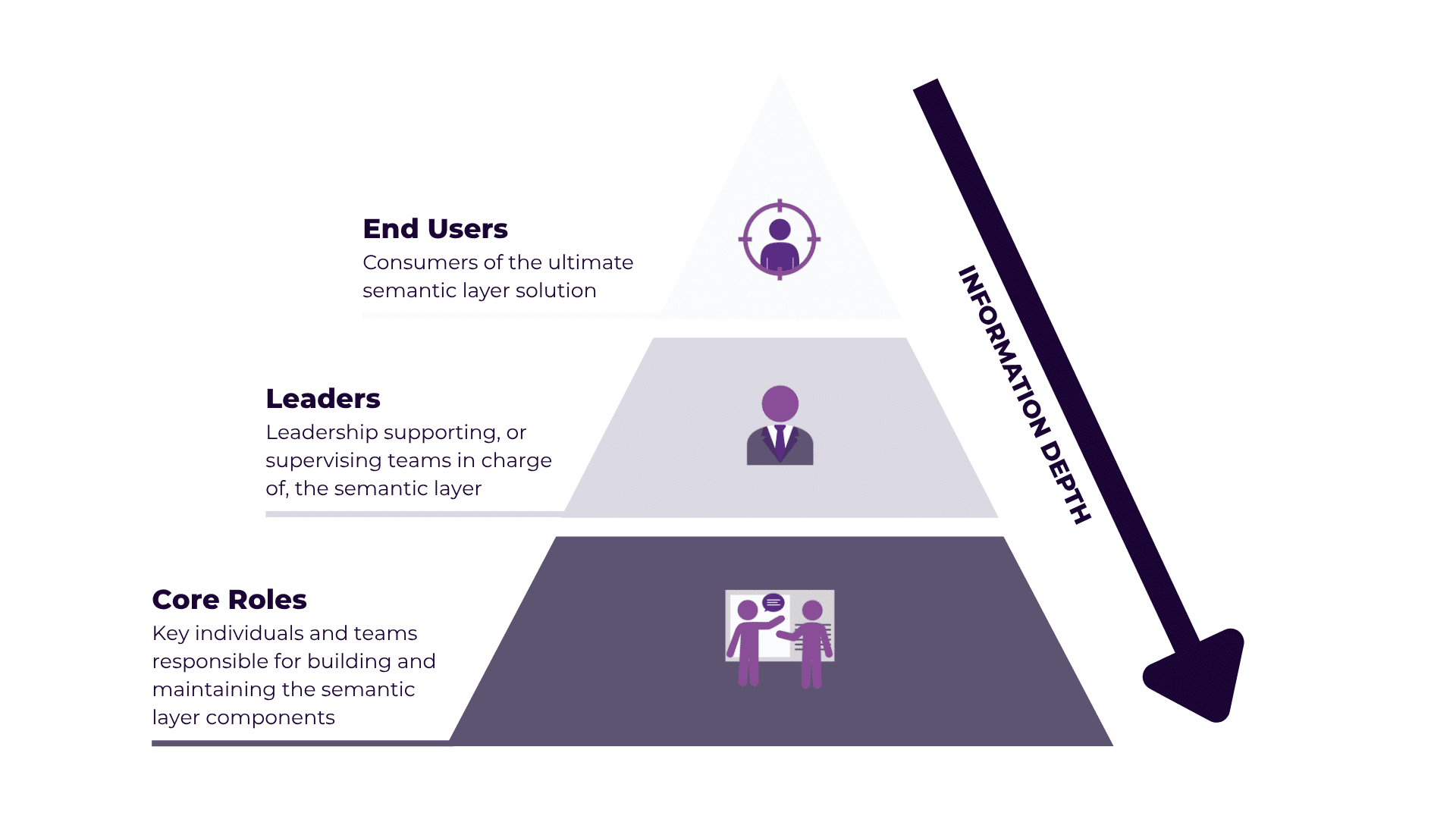 The semantic layer is a framework of standards and tools designed to work and remain behind the scenes. It is the conceptual layer that sits between your organization’s knowledge assets, like content and data, and the people who need to harness that knowledge for their work. Alternatively, think of it as a universal translator that takes disconnected information from your organization and transforms it into contextualized business insights and understanding. While the inner workings of a semantic layer may be complex depending on specific technical factors, the majority of users will never need to understand the technicalities (those are best left to the roles charged with supporting the ecosystem and keeping it healthy). Most users only need to know how to interact with it to supercharge their tools and knowledge retrieval.
