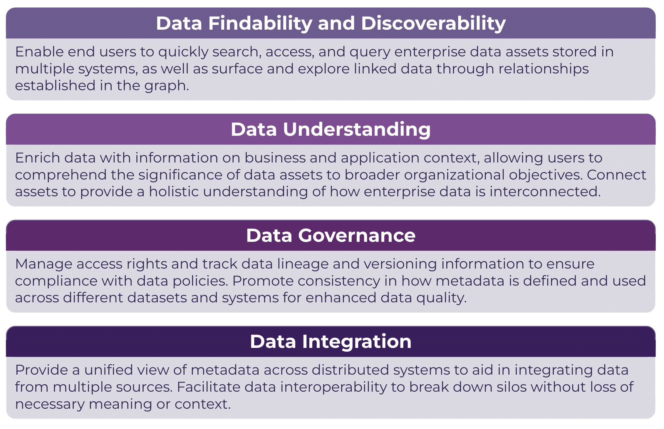 While an enterprise knowledge graph encompasses all data entities and actual data instances across an organization, a metadata knowledge graph specifically focuses on gathering and managing metadata, or information about data entities, attributes, relationships, and their context. Aggregating and surfacing contextual information in the form of metadata – from what data is collected to how it is consumed – ultimately supports data accessibility, findability, traceability, connectivity, governance, and understanding across the enterprise.