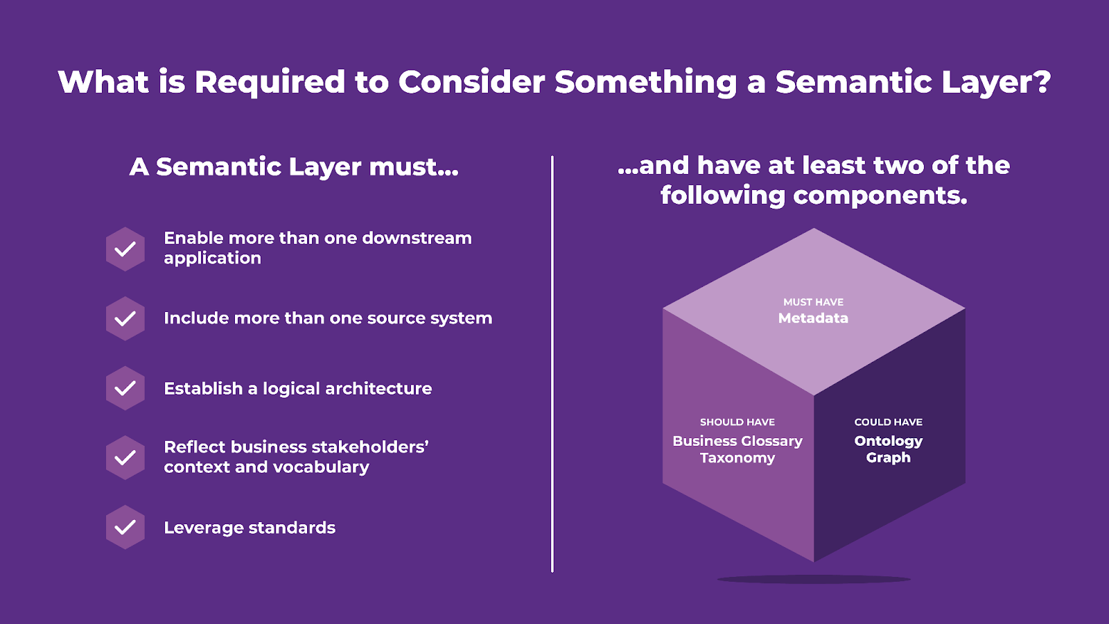 Semantic Layers are an important design framework for connecting information across an organization in preparation for Enterprise AI and Knowledge Intelligence. But with every new technology and framework, interest in utilizing the technological advance outpaces experience in effective implementation. As awareness of the importance of a semantic layer grows, and the market is becoming saturated with products, it is crucial to clearly distinguish between what is and is not a semantic layer. This distinction helps identify architectures that provide the full benefits of a semantic layer–such as aggregating structured and unstructured data with business context and understanding–versus more general data fabrics and semantic applications that may only provide some of its benefits.