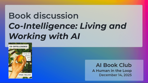 This is a recording of our AI Book Club discussion of Co-Intelligence: Living and Working with AI by Ethan Mollick, held Dec 14, 2025. Our discussion touches upon a variety of topics, including the educator's lens, cautious optimism, the jagged frontier, personas, pedagogy, takeaways, and more. This post also provides discussion questions, a transcript, and terms and definitions from the book.