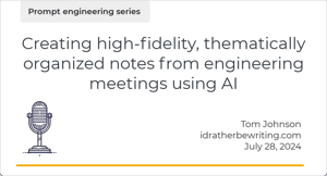 For AI tools to generate accurate information for documentation you're writing, you need to pass in source material. This usually means meeting with engineers and product managers to gather information about the product. In this tutorial, I share prompts for turning those meeting transcriptions into organized, readable meeting summaries. These cleaned up summaries can then function as input context for documentation-oriented prompts.