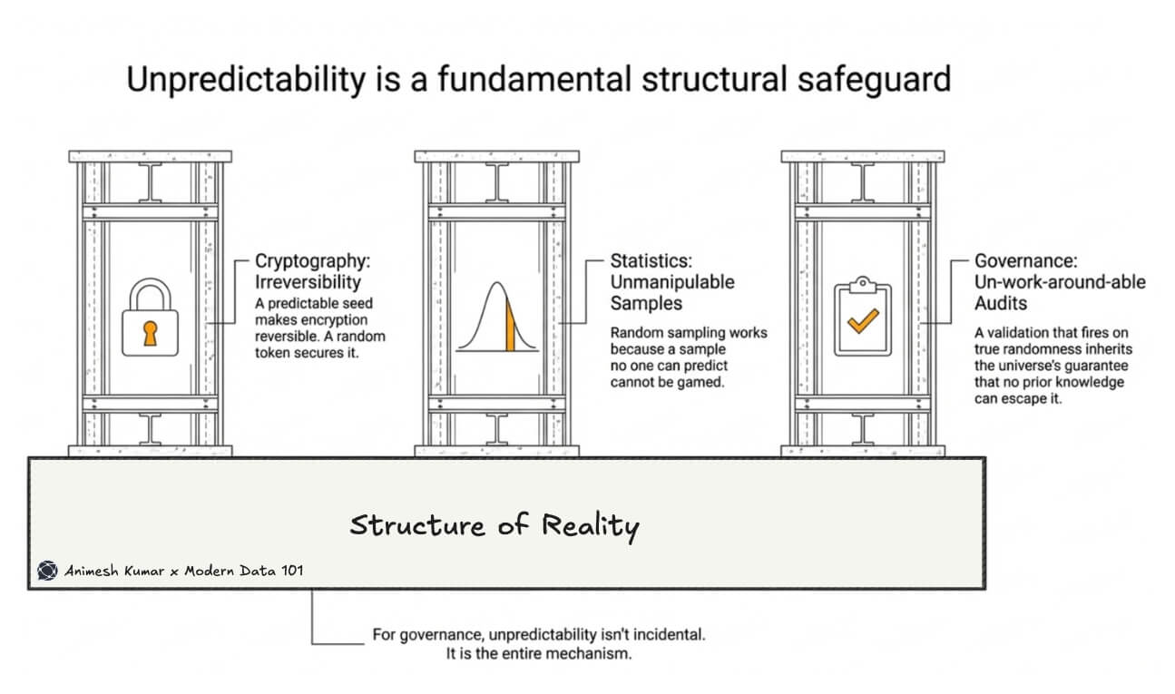 The one thing no code has ever truly producedEvery number a computer generates is, strictly speaking, fake. When a program calls random(), it runs a deterministic algorithm (a fixed mathematical formula) that produces a sequence of numbers which merely looks unpredictable. Feed it the same starting seed, and you get the exact same sequence every time. This is why they are called pseudo-random number generators. The “pseudo” is doing real work.