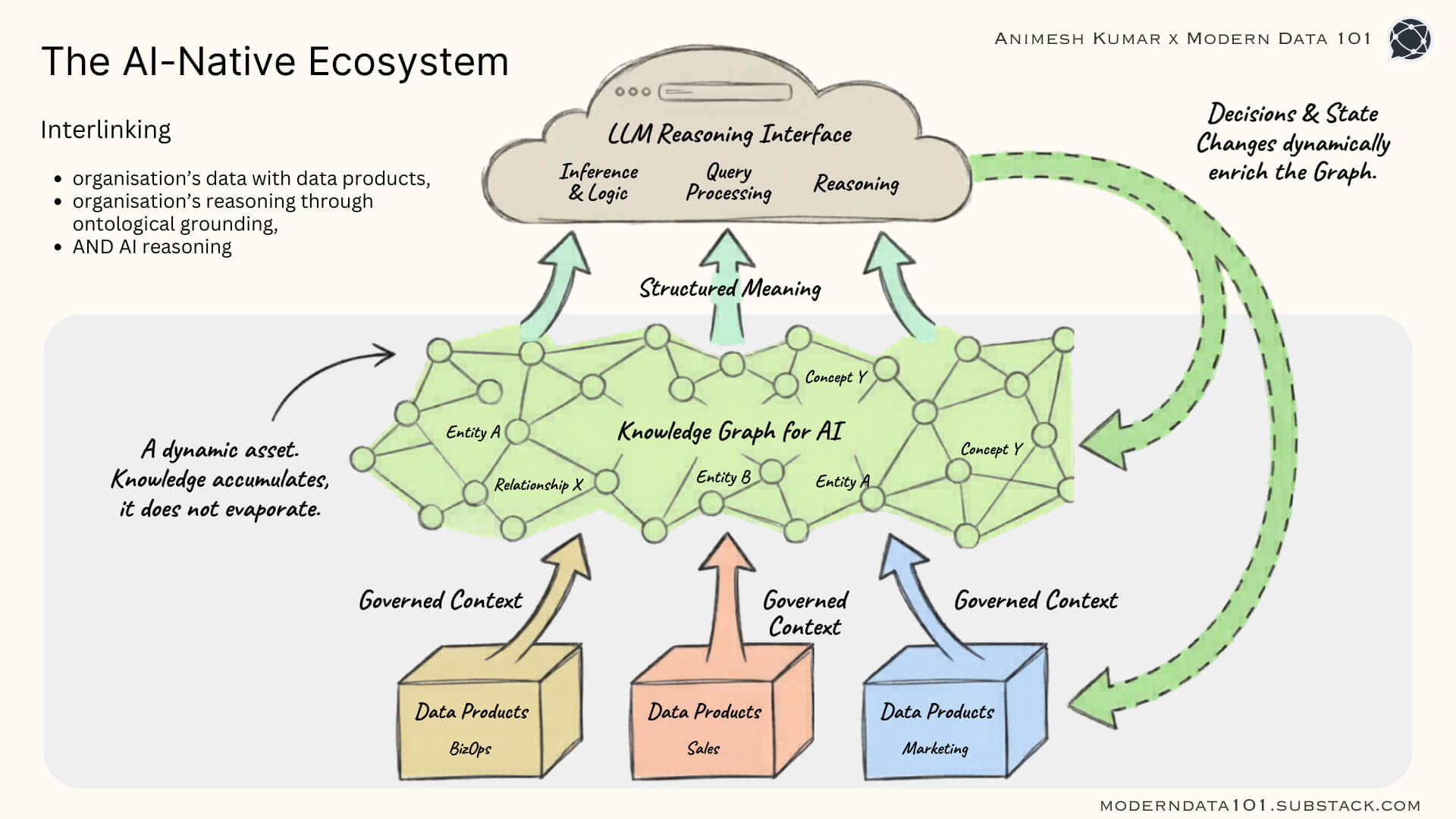 TOCMaterialising a Knowledge Graph for AIWhat Makes a Knowledge Graph AI-ReadyEssential Clarity when Building OneConsider this: every data product already has meaning. Each data product carries its own semantics, like column descriptions, business rules, or domain vocabulary. Now consider this: these data products do not know about each other.The marketing campaigns table has no idea that it shares a causational relationship with the revenue ledger. Even if you tried to tell it, where would you put that information? Inside the table itself? That would corrupt the data product.