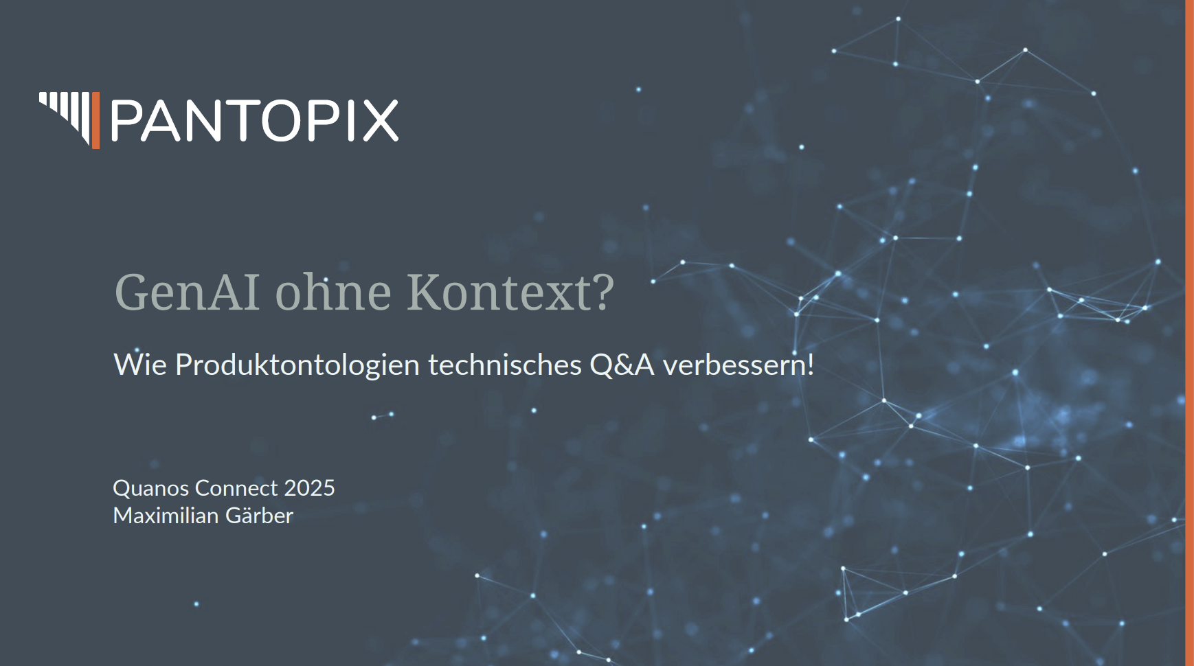 Maximilian Gärber. GenAI ohne Kontext? Wie Produktontologien technisches Q&A verbessern! Quanos Connect, Juni 2025.