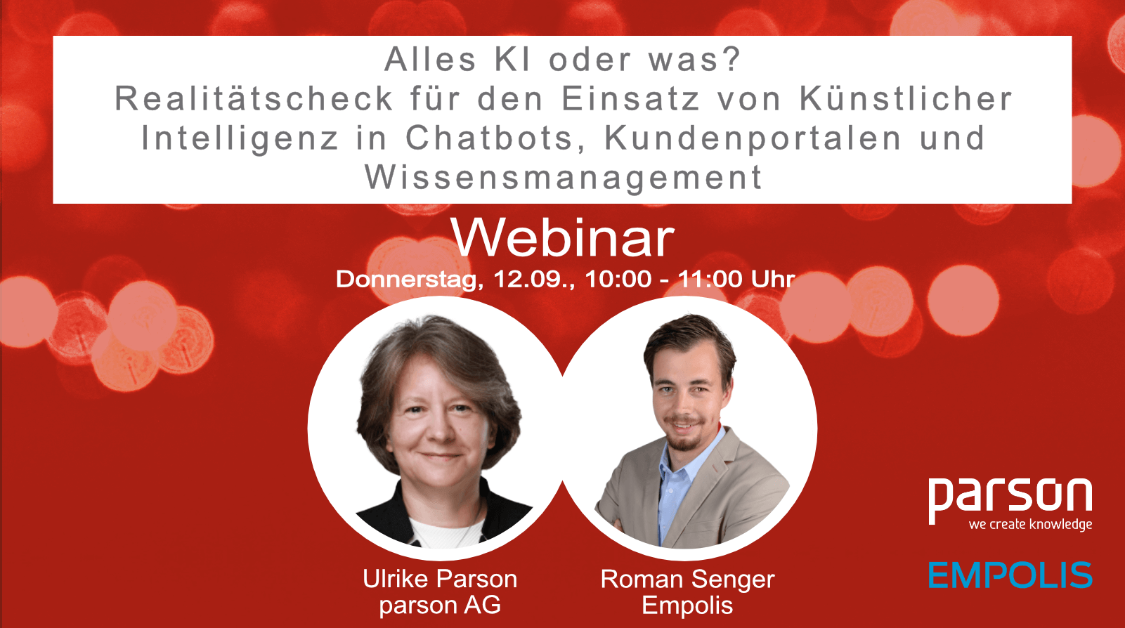 Learn more about this and more in our webinar on September 12, 2024 from 10:00 - 11:00 a.m. with our experts Roman Senger, Channel Sales Manager at Empolis, and Ulrike Parson, CEO of parson AG.