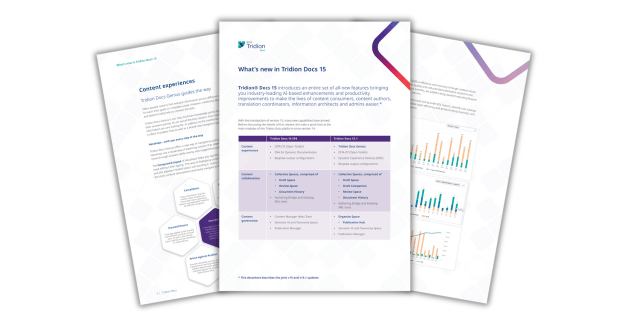 Our latest release of Tridion Docs delivers industry-leading AI-based enhancements and productivity improvements for content consumers, content authors, translation coordinators, information architects and admins.. Download the data sheet to learn in detail how Tridion Docs 15 brings more value for all users with:. Intelligent discovery Content reuse metrics User-friendly headless content Generative AI Greater usability and productivity Improved security and performance Note: this datasheet covers the combined features of v15.0 and v15.